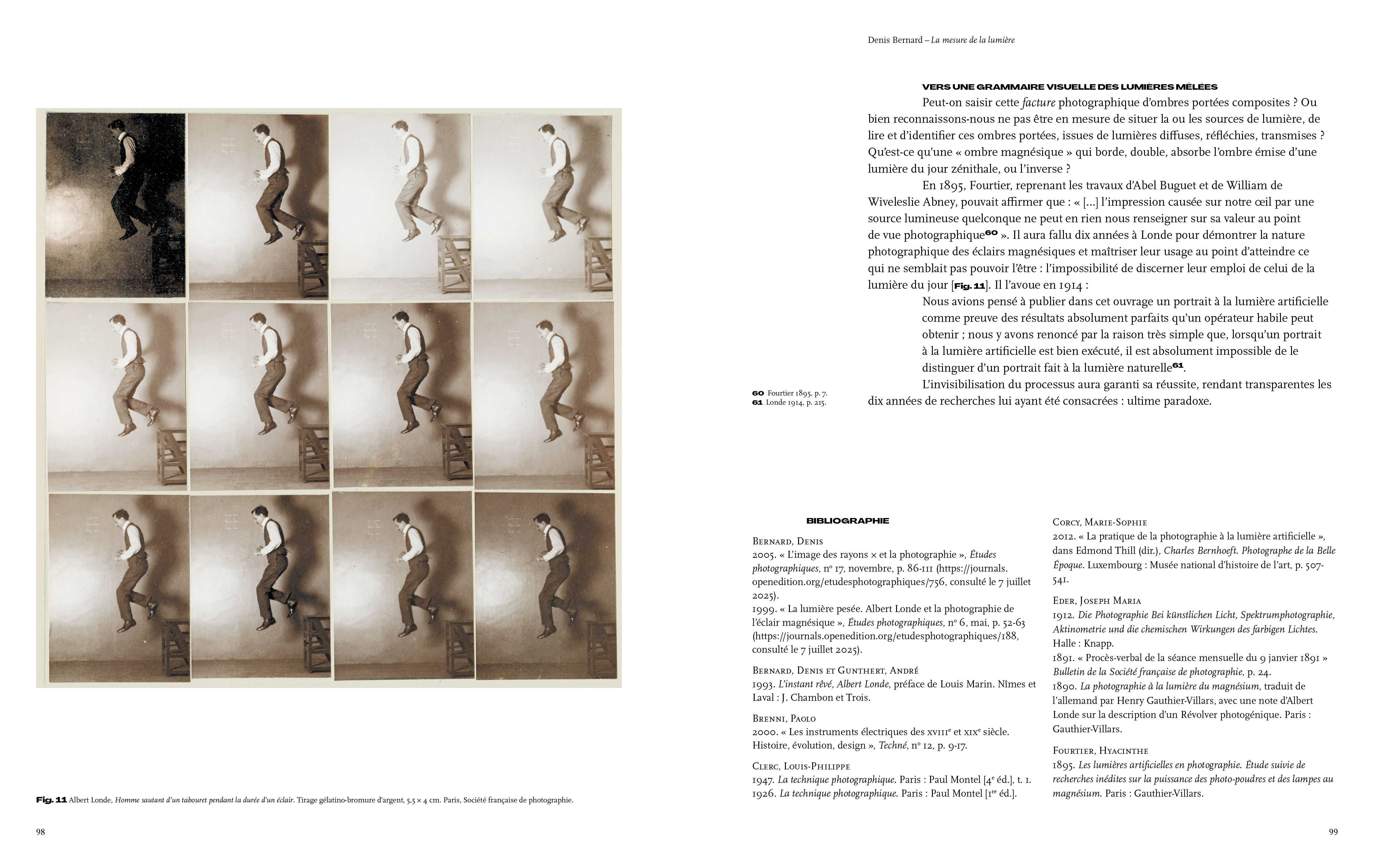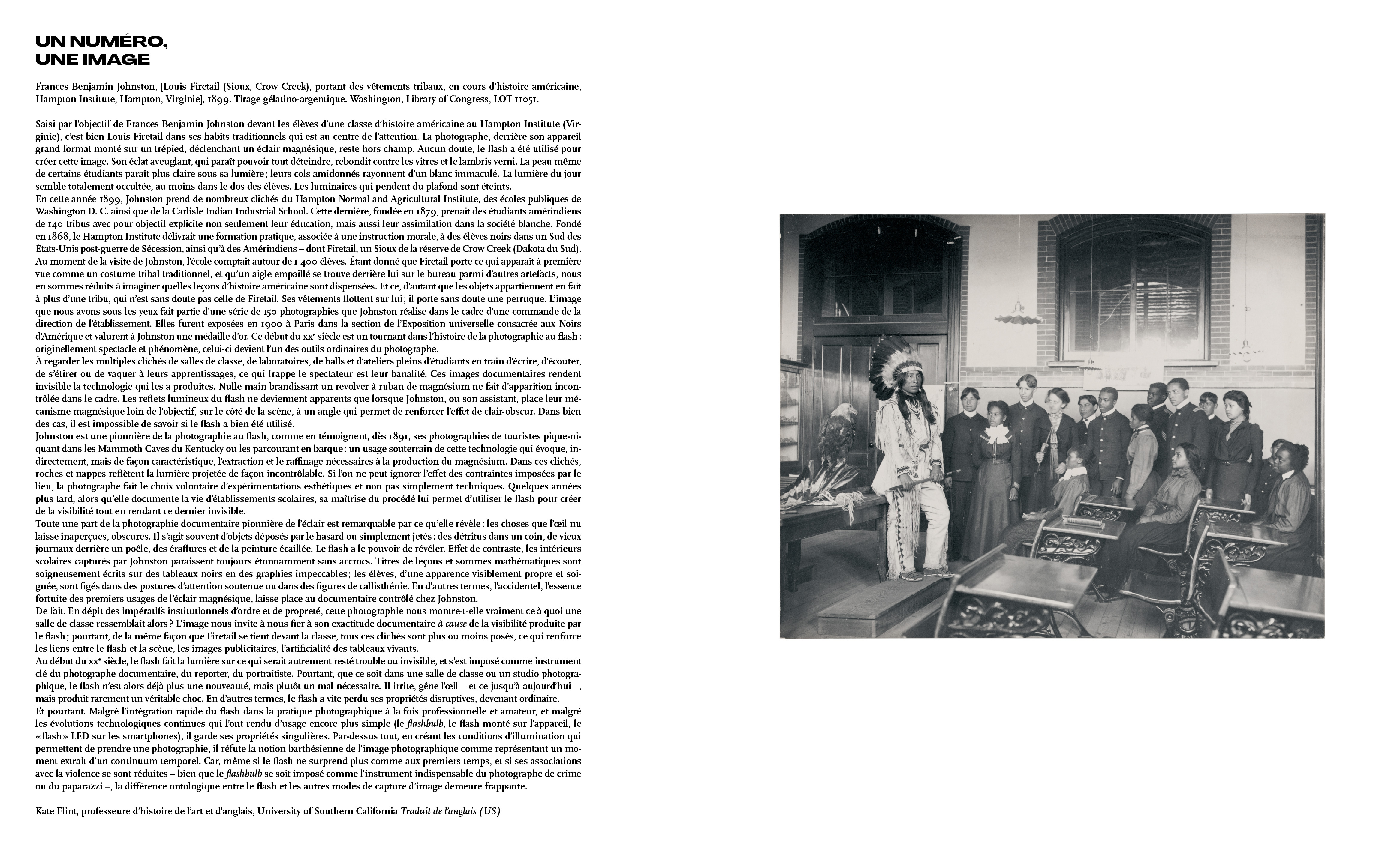 Ce numéro explore ce que les émulsions et les brusques émissions de lumière artificielle, provoquées par différents moyens techniques allant du magnésium au stroboscope électrique, en passant par les flashbulbs, font à la photographie. Cette archéologie du flash entend échapper au récit trop étroit qui fixe une succession d’innovations technologiques, pour prendre le flash, entendu ici en opposition à l’utilisation de la lumière artificielle en continu, non seulement comme une technique, mais aussi comme un point d’articulation possible entre différentes écritures de l’histoire de la photographie. Les dispositifs socio-techniques que sont l’éclair au magnésium et le flash ont contribué à conférer à la photographie une perspective distincte sur le monde, cet « inconscient optique » cher à Walter Benjamin, capable de faire apparaître ce qui échappe à la vue humaine. Depuis ses premiers développements dans les années 1860, la maîtrise de la fulguration s’inscrit dans une histoire longue de la figuration du monde photographiable, dont ce numéro propose l’histoire, envisagée dans ses imaginaires et ses usages sociaux, ainsi que dans les cultures visuelles qui en découlent.